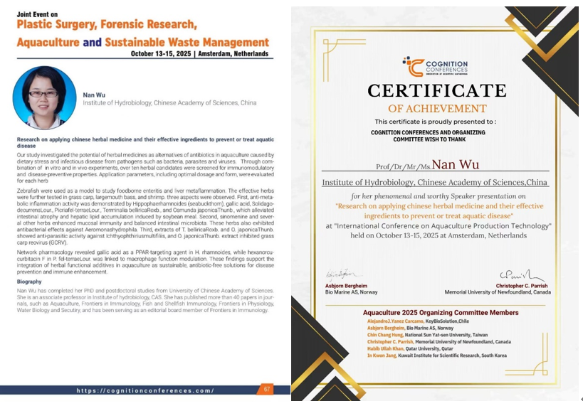 吴南副研究员进行了题为“Fish Metaflammation and Herbal Interventions: Insights from Zebrafish Models to Aquaculture Applications”的口头报告,就鱼类代谢性炎症机理及对其引起的疾病易感状态的中草药调节对策,汇报了研究的最新进展,并就水产可持续开展的热点——抗生素滥用的替代方案研究,和与会国际专家进行了关于不同养殖模式下的应用方式和技术革新相关的讨论。